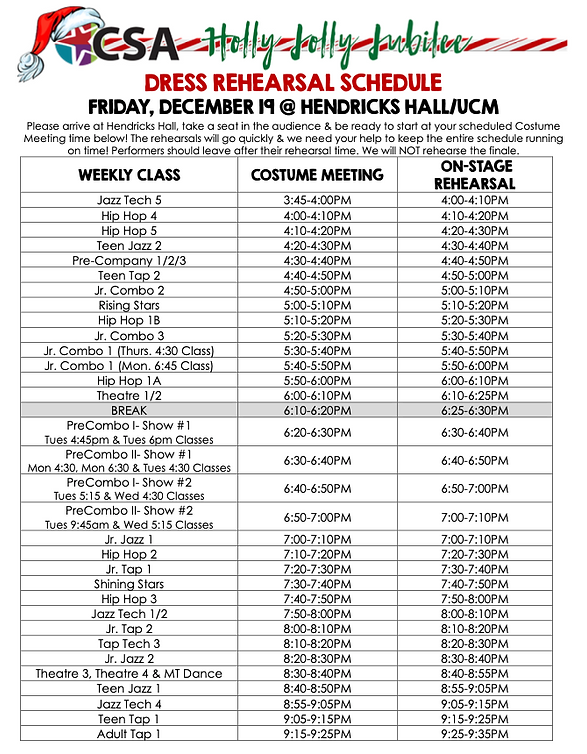 The Dress Rehearsals for both showtimes will be Friday, December 19th at HENDRICKS HALL ON THE UCM CAMPUS! Check out the chart above for your exact times!